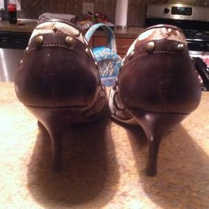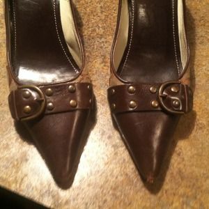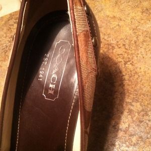 Coach Khaki/Brown leather heels & toes, outlined in brass studding. Pre-Owned good condition. Smoke free home.