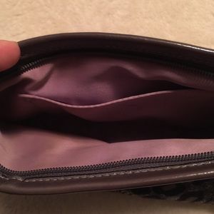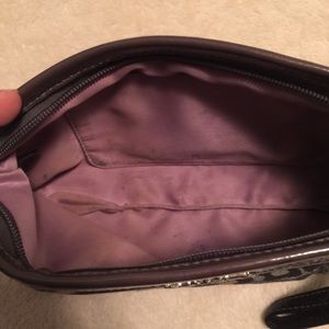 Absolutely beautiful silver leopard print large authentic Coach Wristlet in VGUC. I only say this because there are some makeup stains in the inside (please reference detail images). Does not affect function and still has a lot of life left to it. I used it a handful of times. No rips. Please checkout my other listings. Sold from a smoke/pet-free home. Measures 9" x 5" x 1"