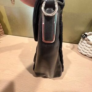 This elegant and beautiful bag shimmers. It has metallic thread that sparkles and the style is so classy. It has a slip pocket on the back with a magnetic snap closure in addition to a front slip pocket under flap. Interior is a gorgeous deep blue with two slip pockets and a zip. Silver hardware. This bag is excellent preloved condition.