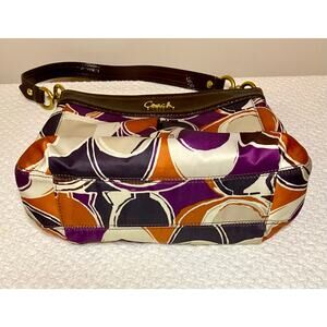This Coach hobo bag is an authentic piece featuring a multicolored hand-drawn scarf print on satin. The bag measures approximately 10 inches by 11 inches, making it a perfect size for everyday use. The unique scarf print design adds a touch of elegance and artistry to the bag, making it a standout accessory. The satin material gives it a smooth and luxurious feel. It's a wonderful addition to any fashion lover's collection!