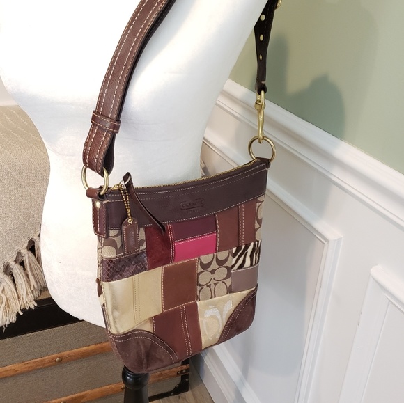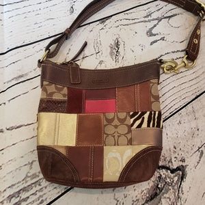 This EUC Vintage Coach bag features a sturdy leather strap. Measures 10inches by 10 inches. Small ink stain to corner bottom lining. Unable to capture in photograph. Non-Smoking home. No odors or scratches.