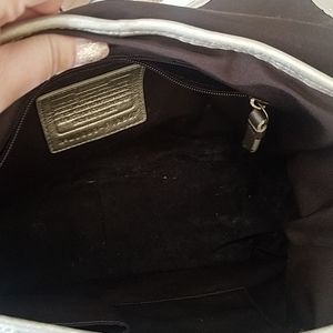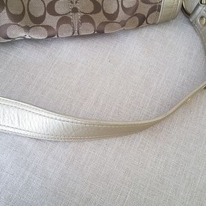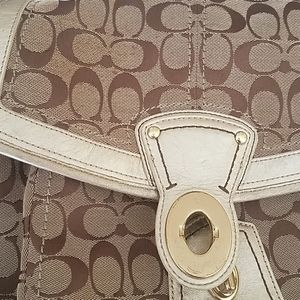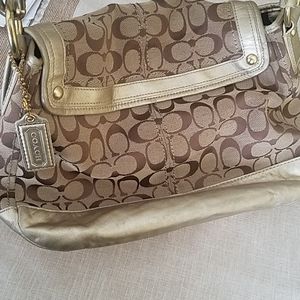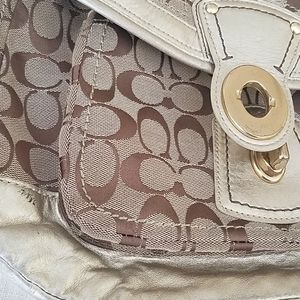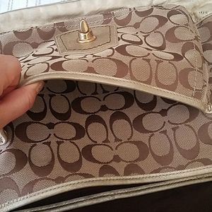 Gold coach purse with minor wear. See photo with a minor black stain barely noticeable. There is a few specks on the front of purse. Inside is pretty much clean with a slight white powder stain. A good purse overall.