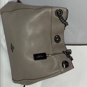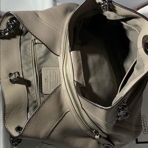 Beautiful purse, barely used! Brushed nickel hardware, middle zipper compartment, several pockets on the inside! Look stylish in this leather purse! I received several compliments when worn!