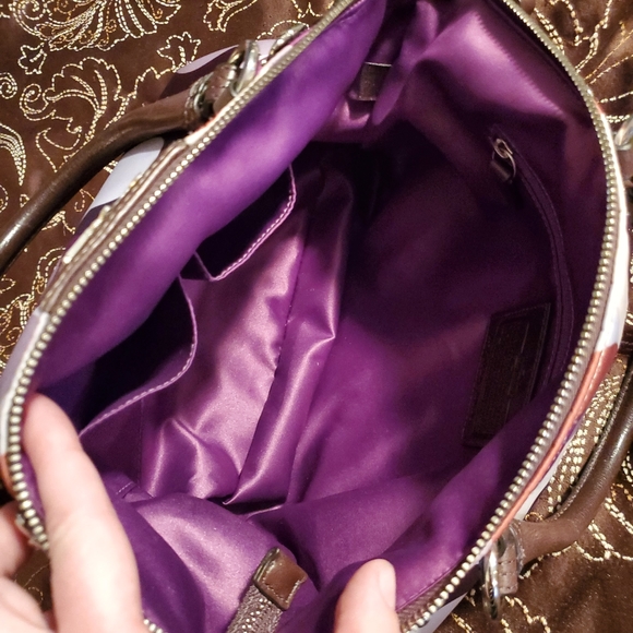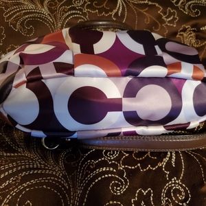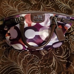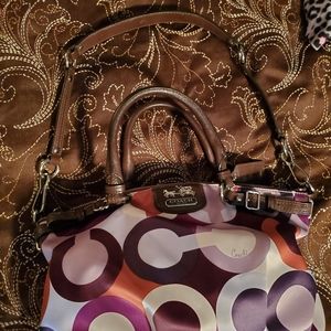 Like new coach purse. No pen marks. The inside is purple. The outside colors are cream, brown, purple, black.