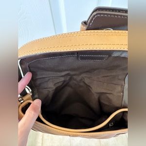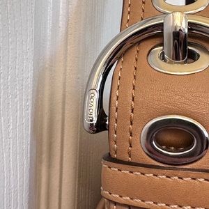 Authentic Coach Purse. Tan shoulder bag. Snap button closure. Has a pocket in the back. When you open the flap it has a pocket behind the flap and a zipper pocket in the main purse area. No tarnish to any of the hardware. Purse is in beautiful condition. Dimensions are 10.5”Wx6.5”H.