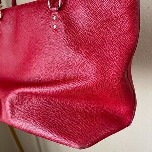 Authentic Coach red leather handbag with gold hardware. A versatile pop of color to elevate jeans, dresses, or work looks. Some signs of wear (see photos), good condition overall.