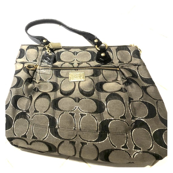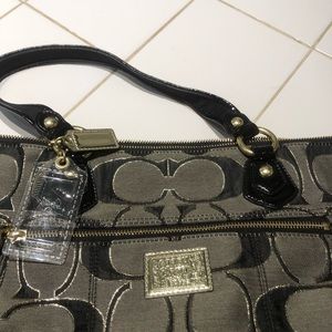 Gently used Coach briefcase bag. Black and silver with Coach emblem stamped in a pattern. Approx 20” wide, with zipper pockets inside and out. Will fit a small laptop. Excellent condition from a non-smoking household.
