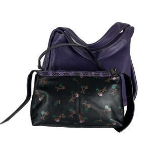The Authentic Coach Shoulder Bag Bandit Hobo 39 in Pebble Leather with a Purple Cherry Pattern is a large square-shaped shoulder bag perfect for travel, casual, or business occasions. Made with pebbled leather in a solid purple color with cherry accents, this vintage-inspired bag features silver hardware, a magnetic closure, and double purple leather handles. The bag includes inner pockets, a removable pouch, and a detachable mini bag, making it a versatile and stylish accessory for any season. With the iconic Coach brand and elephant hardware, this bag exudes elegance and modern femininity in an elevated casual style.