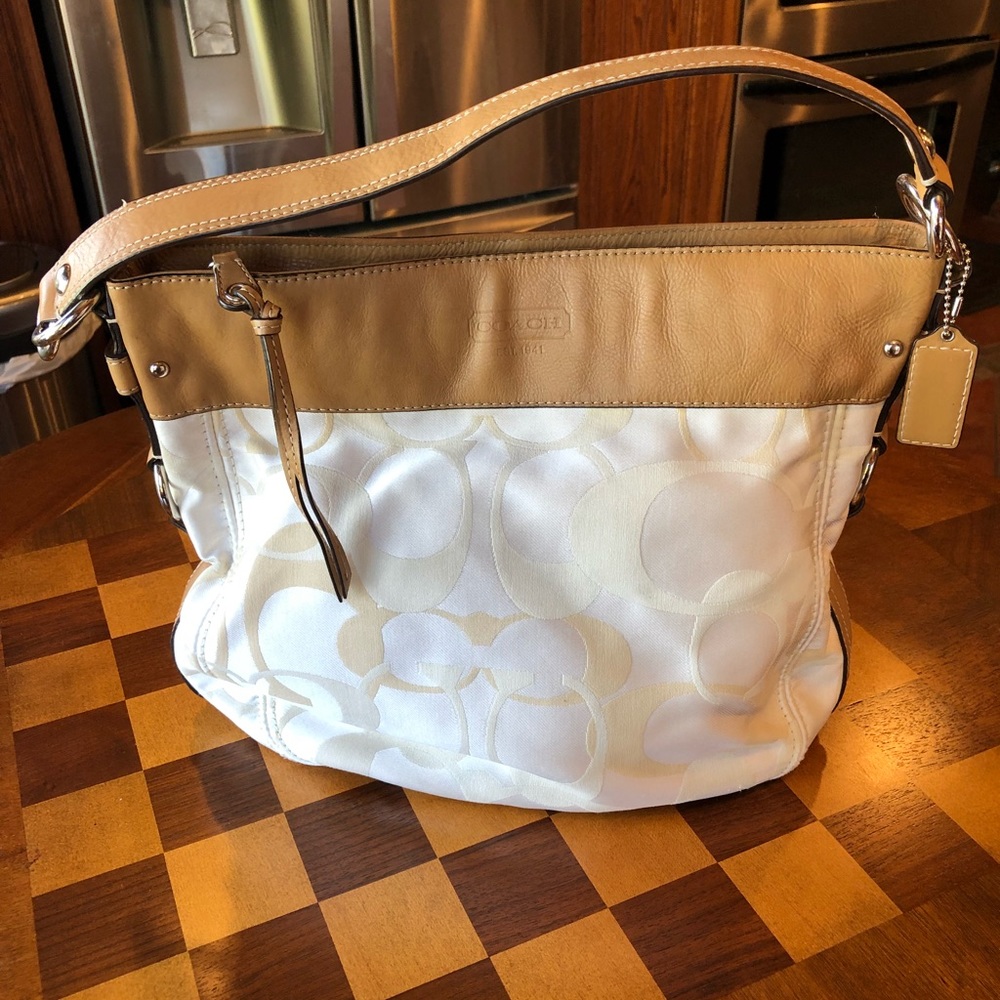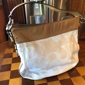 Adorable pre owned excellent condition authentic coach signature hand bag. Khaki beige fabric with light brown leather shoulder tote... Inside the fabric lining has a few small markings. I try to describe my items as best as possible... please don’t hesitate to ask questions.