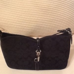 Black fabric authentic Coach purse, 9" wide and approx 7" deep. One inside zippered pocket. Leather shoulder strap and bottom of purse is also leather Silver hardware. Perfect bag for any occasion!