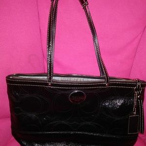 Authentic Coach signature purse/tote, made of black patent leather. It has all silver hardware with a zipper closure & double handles. The interior is a light blue silk with a zipper pocket on one side and 3 slip pockets on the other side. Still in good used condition throughout! There are no stains, holes or damage! Only sign of use it has is a dark spot lining around the zipper closure which just needs to be cleaned good & wiped down!
