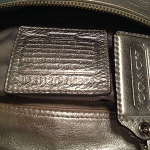 Gorgeous Silver Champagne Coach Hand Bag. Two hand straps and a longer detachable shoulder strap. Zippered top opening with Coach keychain intact. Measures 12"L x 4 1/4"W x 7"H. Leather Creed intact & has two interior pockets- one is zippered for more security. No stains. One wear mark just above Coach medallion.  Used gently and well maintained. Price Firm unless bundled๐