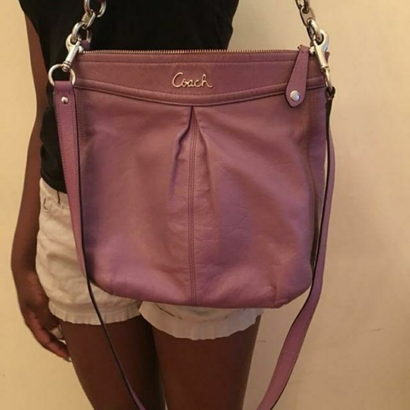 Leather purse that can be used as a tote or crossbody. Different compartments for storage space. Lavender in color.