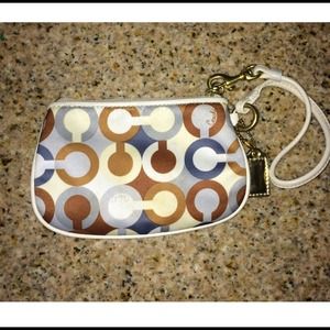 Adorable Coach wristlet! Blues, white, off white and copper colors. Leather detailing and wrist strap. No fraying or stains inside. Minor discoloration near zipper as pictured. Only used twice!