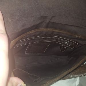 Brown Coach bag. Fabric, leather, and velvet. Lightly used, no stains (there is some shadowing in the pics. Magentic closure with bag size small pocket, and two smaller open pockets inside. One zipper pocket inside. In great condition.