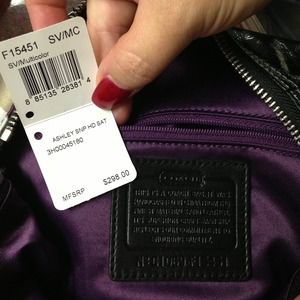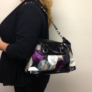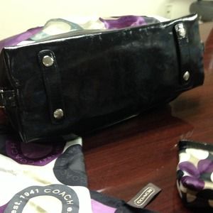 Purple grey &black silk bag with black patent leather detail. Gently used with no rips no stains. 100% silk bag scarf no stains. Coin purse has some discoloration but could probably come out in wash. Coin purse is free. Price will not be discounted do to coin purse condition. Include authentic tag and dust bag. 2 years old
