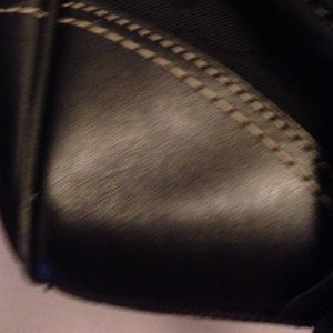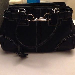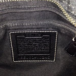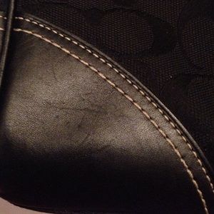Authentic preloved Coach canvas tote bag with leather edges and handles. Coach embossed on hook decoration in front. Tassels attached to handle. Has four silver "feet" on base. Zipper closure. Has some scuff marks on leather edges but still in great condition.