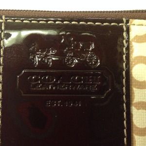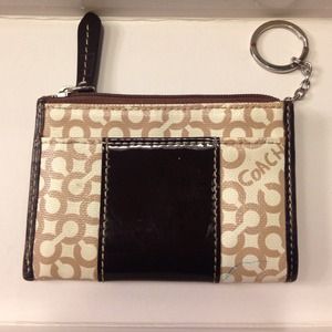 Authentic coach change purse/credit card carrier. Brown and ivory. There is a small blue pen mark on the back side. See the last picture. Any questions, just ask!