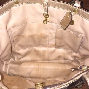 Gold coach handbag with shoulder straps. Slight staining on inside of the bag, reflected in price.