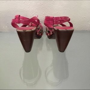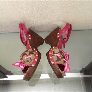 Coach Pink Ruby signature canvas heels! Wooden heels, open toed, ankle strap. Worn three times. Matches coach purse and wallet!