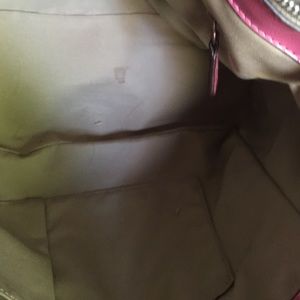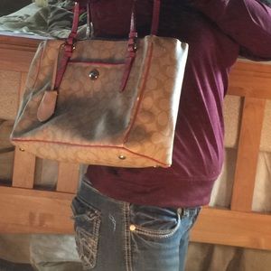 Large Coach bag with wearing on the handles and a small stain in bottom. It does have outside zippered pockets and large center pocket. Other than the handles great condition