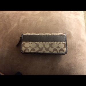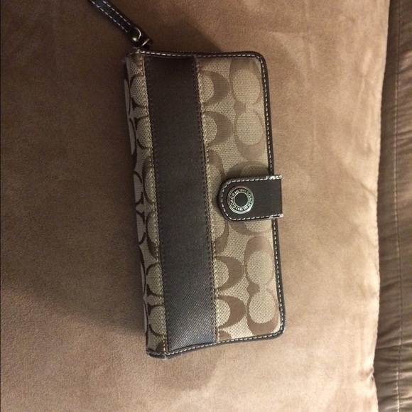 Authentic Coach wallet, brown. Adorable, and previously loved. Wear and tear from being so loved shown in pictures at the button, a little frayed at button too. Pleather part has some cracking, and minor scuffs and scratches. Great fixer upper!