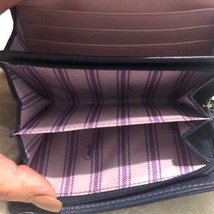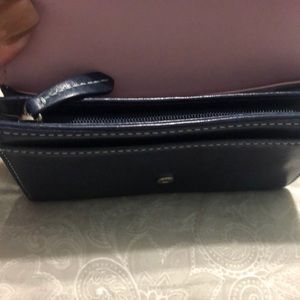 Navy blue, five credit card slot, zippered change pocket, money pocket and 6 additional slots