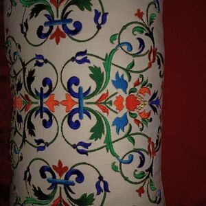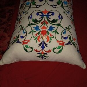 NEW Callisto Home Limited Edition Unique Pattern SOLD OUT This Embroidered Collection Colorful embroidered decorative pillow with intricate patterns. Features vibrant designs in blue, green, orange, and red on a white / off white background.
