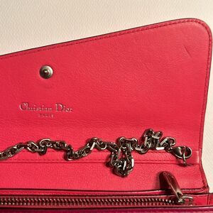 Authentic Cristian Dior Leather Pink/Coral Wallet on a Chain Flap top with snap closure,Card holder,No rips ,No tears,No smell.Minor wear,No coin residue.Missing bag charm,Silver Removable chain.Approx measurements Length 7.5”,Height 3.75”.EUC 02-LU-0144