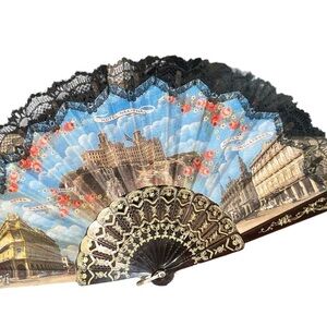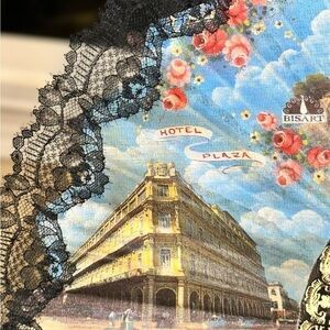 Beautiful hand fan with intricate scenic design. Features lace trim and detailed handle. Perfect for display or use. Recuerdo / Souvenir Abanico de Cuba. Hotel's de Habana. Hotel Plaza, Hotel Nacional, y Hotel Inglaterra. Cuban handheld fan. Havana Hotel's.