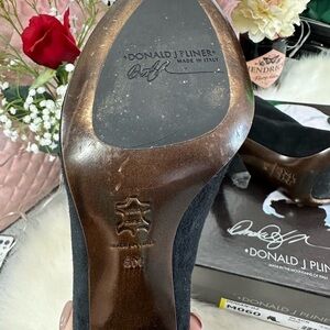 In excellent condition, these boots may have minor scratches from wear, but their overall quality remains impeccable. Complete with the original box, these Donald J. Pliner black suede booties are a must-have for any luxury shoe collection.