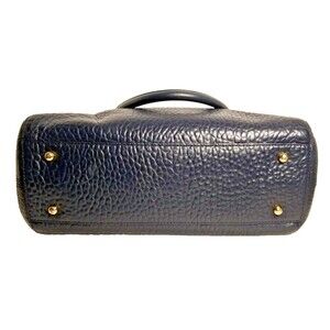 This Daks London satchel handbag is a stylish addition to any wardrobe. The pebbled Navy Blue leather exterior features studded accents and gold-tone hardware. The bag has a zip and magnetic closure to keep your items secure, and double handles with a 6.5" drop for easy carrying.