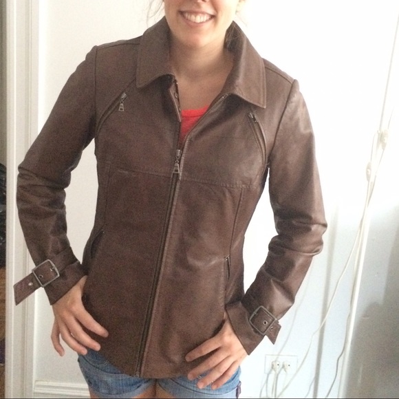 Very lightly worn! Size small. The jacket is quite thick and warm (cold Canadian winter!), so definitely able to wear for late fall and even into the winter. It's real leather, in great condition with some small darker discolourations but barely noticeable. Lined and with a belt across the back to cinch the waist a bit!