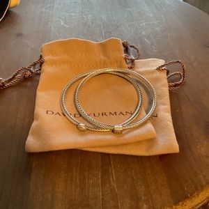 Beautiful rare DY bangles with diamonds. 2.5 inch diameter. Comes with pouches and polishing cloths. Sadly they are too small for me…..