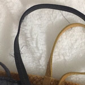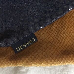 These are Authentic DESMO Blue and Gold fabric croc embossed tote bags. They are super light weight, shimmery, two thin black patent leather handles, and a draw string on the sides. These come with only ONE dust bag. Please see some fraying on the handles. Brand new never used.