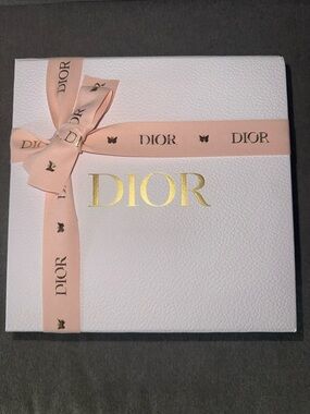 Luxurious Dior box with a textured finish. Features elegant gold lettering and a beautiful pink bow. Size is approximately 8 x 8 x 3.5