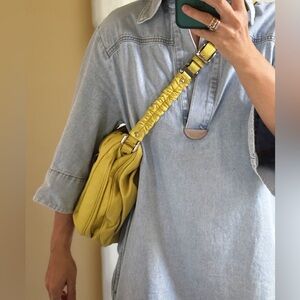 Love this bag! This is a stylish shoulder bag in a vibrant yellow color, The design includes a prominent front pocket with a buckle detail, adding both functionality and a touch of flair. The bag is not too large nor too small; its size is just right, making it versatile for various occasions. Gently used, overall in excellent condition!