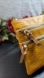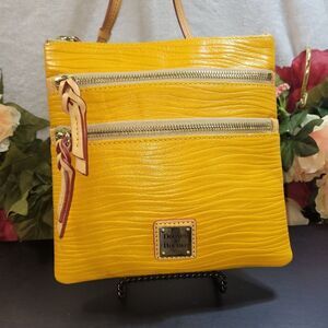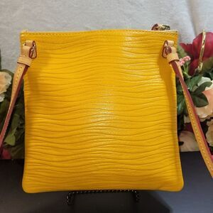 Authentic Dooney & Bourke Crossbody Bag that is in excellent condition. So cute and tons of space. Great for everyday use or special occasions. Exterior leather is in excellent condition. There isnt any damages to the edges or corners. There is a tiny spot on the front left side, please see 2nd to last photo for better explanation. It is very minor. 3 zipp3r pockets for storage of all of the important items. Long leather shoulder strap that is adjustable. Color is like a Marigold yellow.