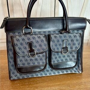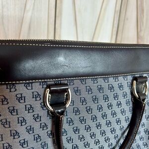 Very gently used Authentic Dooney & Bourke Double Pocket Tote in Navy canvas with a deep brown leather trim and silver hardware. With matching small cosmetic bag or coin purse. Only carried a couple times! Some minor scuffs in leather (see picts) and a few very faint spots inside. Long strap not included. **From a smoke and pet free home!
