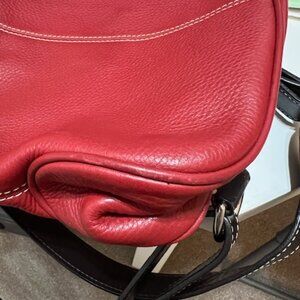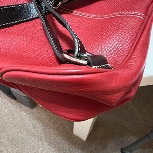 Listing is for an authentic Dooney & Bourke Vintage Red Pebble Leather Backpack, in excellent used condition. The outside corners do have slight wear (see photo), but not noticeable. Exterior does have a slight scratch on back (shown on photo), but also not noticeable. Features: Inside key strap, zipper pocket, iconic Dooney & Bourke logo, and zip-top closure. Measures 11 inches wide, 12 inches tall, & 3-1/2 inches deep. Hardware is silver tone, there is a 3 inch top drop handle, with adjustable dark brown leather backpack straps.