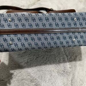 This stylish Dooney & Bourke handbag features the signature DB monogram pattern on a durable fabric. Accentuated with rich brown leather trim and dual front pockets, this bag combines form and function. It includes a spacious interior with a zipper pocket, making it perfect for daily use or travel. The adjustable strap offers versatile carrying options, ensuring comfort and style on the go.