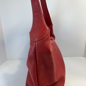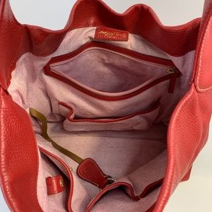 Stunning red leather bag in pristine condition. This is a fun everyday bag to being a "going out" bag. The hobo style provides plenty of room to hold everything one might want to carry. The bag measures 11x16 and the handle drop is 8 inches. Attached ( but removal) in the inside is a matching key fob.