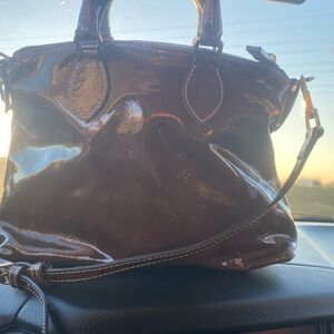 Authentic Dooney and Bourke patent leather satchel/crossbody in a dark brown