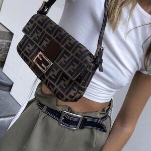 This is an authentic vintage FENDI Zucca Baguette. This stylish baguette is crafted of Fendi Zucca canvas in brown. The bag features an added black shoulder strap and trim with a facing flap and silver hardware with a matching FF logo. This opens to a brown fabric interior with a zipper pocket. This stylish baguette features a leather adjustable shoulder strap. Snap Closure at Front. Canvas Lining & Single Interior Pocket. Base length: 9.8" Height: 5.9" Width: 1.5" Drop: 8" (adjustable) Condition: Excellent vintage. Minor signs of wear present. Please refer to all photos as they are part of the description. 📦 We Ship Daily 💎 100% Positive Feedback ❣️ Follow Us For Latest Designer Arrivals ❇️ NEW to Poshmark? Sign up with code THERELUXE and get $10 OFF! ⚜️ AUTHENTICITY GUARANTEE: All The Reluxe™ items are carefully selected and authenticated by our team of experts. Our items are stored in climate-controlled warehouses and come from smoke-free/pet-free homes. This item has no offensive odors. Preloved vintage items may smell like their materials/storage. We specialize in sourcing rare and vintage top condition luxury pieces from Chanel, Louis Vuitton and more. If you are looking for a specific piece leave us a comment and we will do our best to find it for you! Tags: fendi baguette, fendi mamma baguette, fendi zucca baguette, fendi peekaboo, fendi peekaboo x-lite, fendi croissant, fendi sunshine shopper, fendi by the way, fendi mon tresor, fendi kan i, fendi first