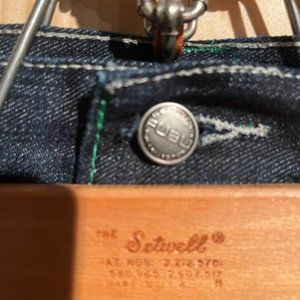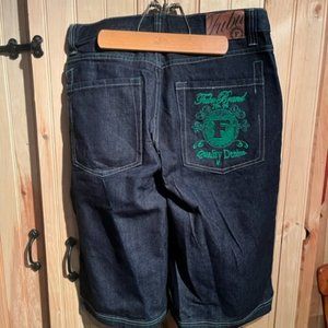 Own a piece of Rare Vintage Fubu awesomeness with these amazing jean shorts! There is a green "F" embroidered on the front right mini pocket as well as a large embroidered "Fubu Brand Quality Denim" surrounding a letter "F" in a decorative circle. The shorts are further accentuated with matching green stitching making these Hip Hop favorites Sizzle! The size is 34 waist and 15" long from crotch to the bottom of the shorts.
