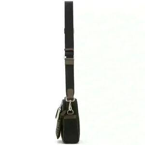 Panelled textile messenger bag in black. Detachable and adjustable webbing shoulder strap with lanyard clasp fastening striped in green, white, and brown. Detachable zippered pocket featuring logo-patterned calfskin trim in beige at face. Zip closure. Zippered pocket and logo plaque at interior. Tonal textile lining. Silver-tone hardware.
