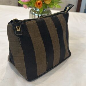 Elegant black leather pouch. Features a gold Fendi logo accent. Ideal for carrying essentials. It has typical rubs on bottom corners/edges but no other flaws to mention. The canvas, zipper and inside are all good and clean without unpleasant smell.
