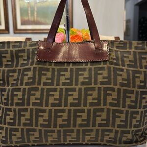 Elegant Fendi tote with signature logo design. Features olive and dark brown tones. Ideal for daily use. It has wear on leather parts but still has a lot of life left. It doesn’t have stains or any damage or any unpleasant smell. PRICE IS FIRM!!!
