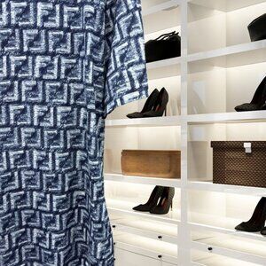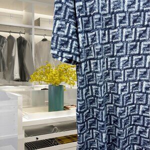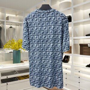 Introducing the quintessential expression of refined casual wear, the Fendi Monogram T-shirt. Crafted with meticulous attention to detail, this piece is a testament to the luxury and craftsmanship synonymous with the Fendi name. The shirt's dominant navy and blue hue is elegantly offset by a striking, white geometric monogram pattern that envelops the fabric, creating a visual spectacle of high fashion sensibility.