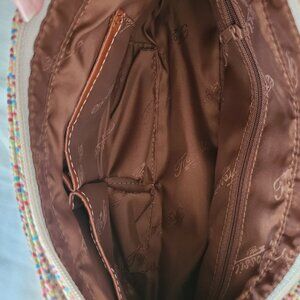 LIKE NEW! CLEAN AND WELL-MAINTAINED SMOKE-FREE HOME Fossil 1954 multicolor fabric 3 section purse with leather accents Versatile multicolor heavy fabric Tan/brown/turquoise/pink/khaki weave Wrapped leather handles Leather zipper accent Leather bottom Middle zipped section Two additional side sections Silver hardware accents Approximate size 14" wide 6" high 5" deep 9" strap drop Fabric and leather in great condition- no rips, tears, ONE small mark in bottom of bag.